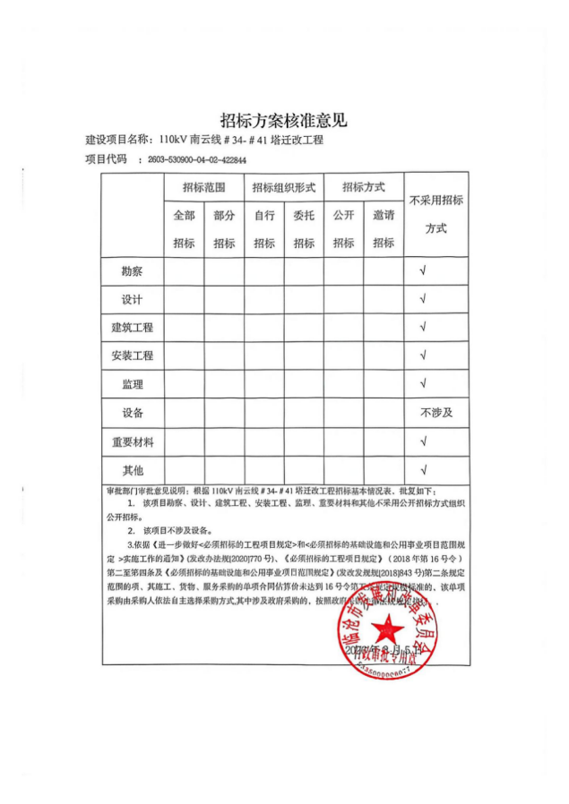 六、项目的设计、建筑工程、安装工程、设备等要按国家有关规定全部进行招标,招标方式为公开招标,招标组织形式为委托招标;其他等不采用招标的方式;不涉及勘察、监理、重要材料等。本项目为依法必须招标的投资项目,其招标活动应当进入云南省各级公共资源交易中心;中央管理企业招标按国家相关规定也可使用自有电子招标采购交易系统,但应当通过国家电子招标投标公共服务系统有序纳入公共资源交易平台,依法接受监督管理。请项目法人加强与有关行政监督部门联系,依法组织招标工作。