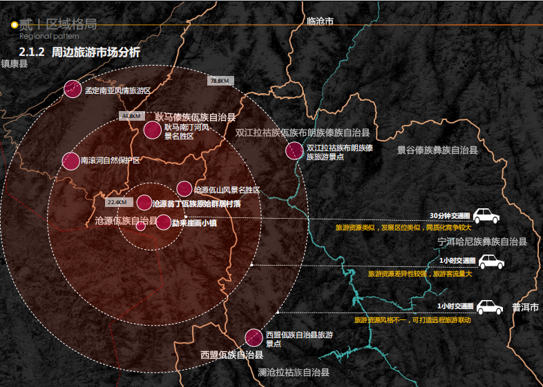 4.区位交通 | 1.区位交通临近佤山机场、佤山机场三级公路,交通便利,可直达司岗里崖画谷景区,辐射糯良乡、勐来乡;2.目前,双江高速已建成,瑞孟高速即将建成,将有利缩短各东西方向到沧时间,有效降低成本。 | |