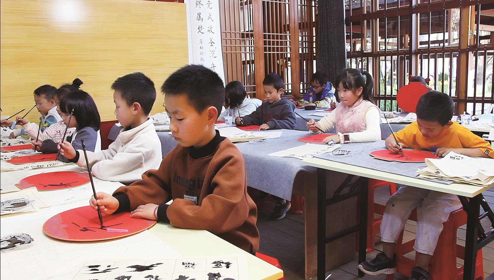 小朋友在写福字。