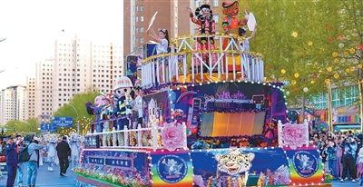 傍晚时分,青海西宁市城北区豹街开启花车巡游。