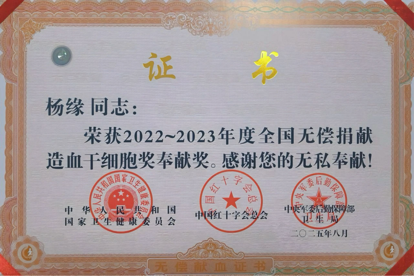 近日,临沧市精神病专科医院杨缘同志荣获2022~2023年度“全国无偿捐献造血干细胞奉献奖”。这一由国家卫生健康委员会、中国红十字会总会、中央军委后勤保障部卫生局联合授予的殊荣,是对她以无私大爱为生命续航、用滚烫初心诠释公益担当的最高褒奖,也为医院深耕公益事业的历程添上了浓墨重彩的一笔。