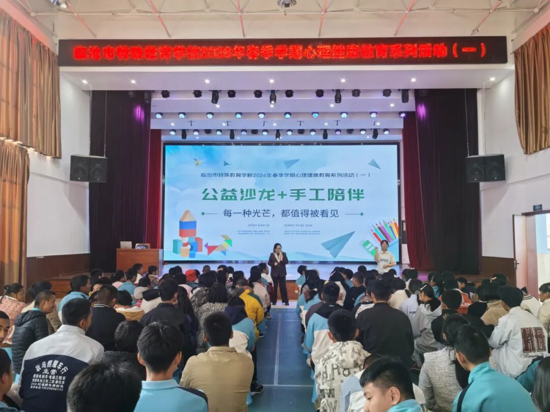 为扎实推进学校心理健康教育工作,以专业力量守护特殊学生心灵成长,临沧市特殊教育学校2026年春季学期心理健康教育系列活动正式启动。3月20日上午,首场活动正式开启,本次活动由学校统一安排部署,德育处精心策划、组织,邀请临沧市家庭教育协会为我校聋部、培智部7—9年级及职高班共155名学生开展以“每一种光芒,都值得被看见”为主题的公益沙龙+创意手工陪伴活动。通过陪伴点亮心灵,用手作传递温暖,让每一位特殊孩子感受快乐、创造美好、被尊重的权利,在接纳与鼓励中自信成长,绽放独一无二的光芒。