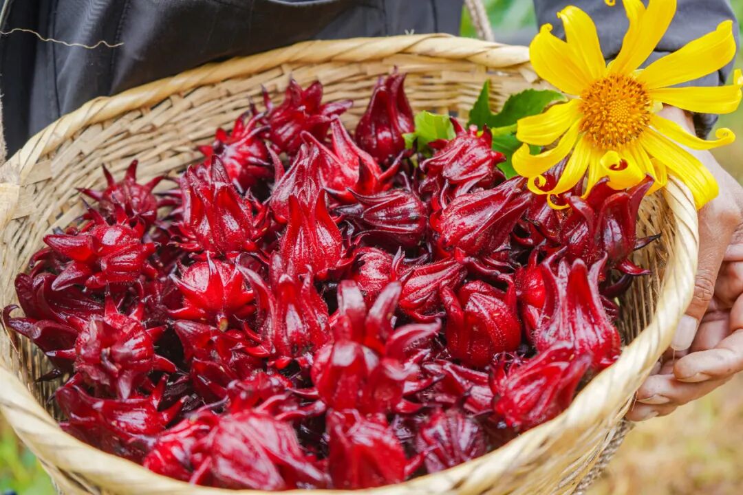 将晒干的洛神花与现磨的咖啡粉一同冲泡
