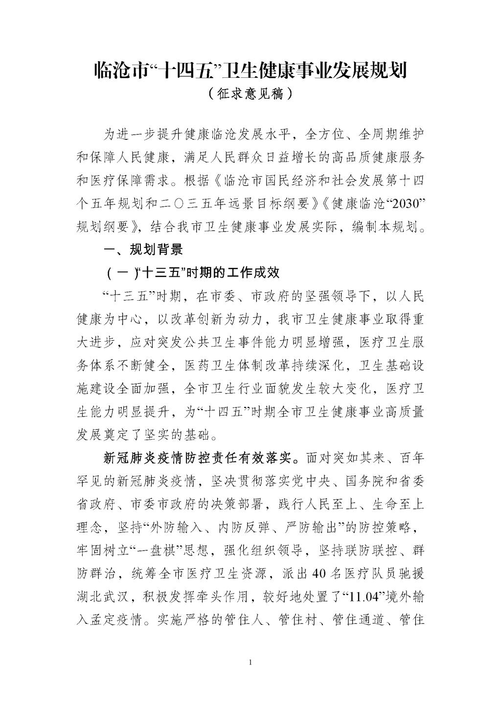 按照《云南省重大行政决策程序规定》履行公众参与、专家论证、风险评估、合法性审查、集体讨论决定程序,现将《临沧市“十四五”卫生健康事业发展规划(征求意见稿)》予以公示(详见附件)。