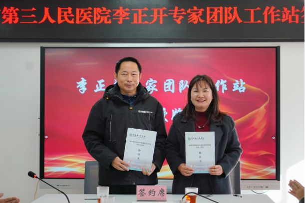 在热烈掌声中,李正开专家与李海院长签署合作协议,李正开专家与凤庆县人民医院精神科主任高映珊完成授牌,标志着工作站正式落户。