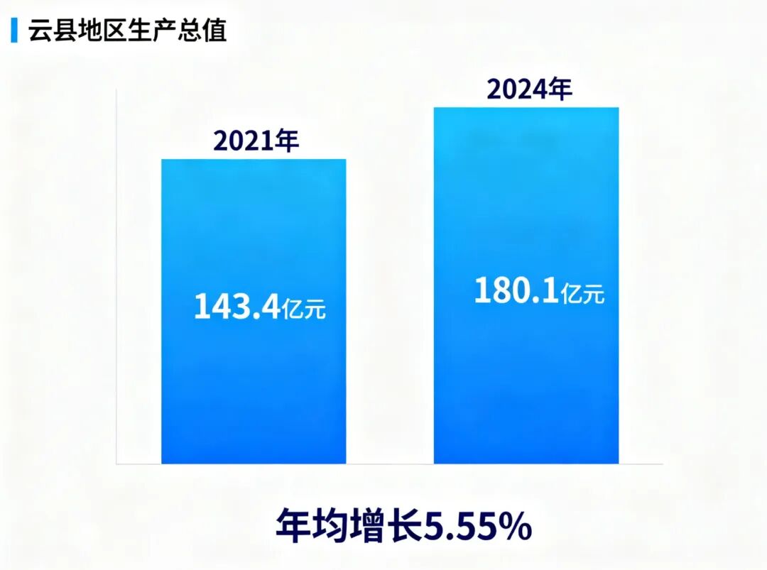 2021年至2024年,云县地区生产总值从143.4亿元稳步增长至180.1亿元,年均增长5.55%。