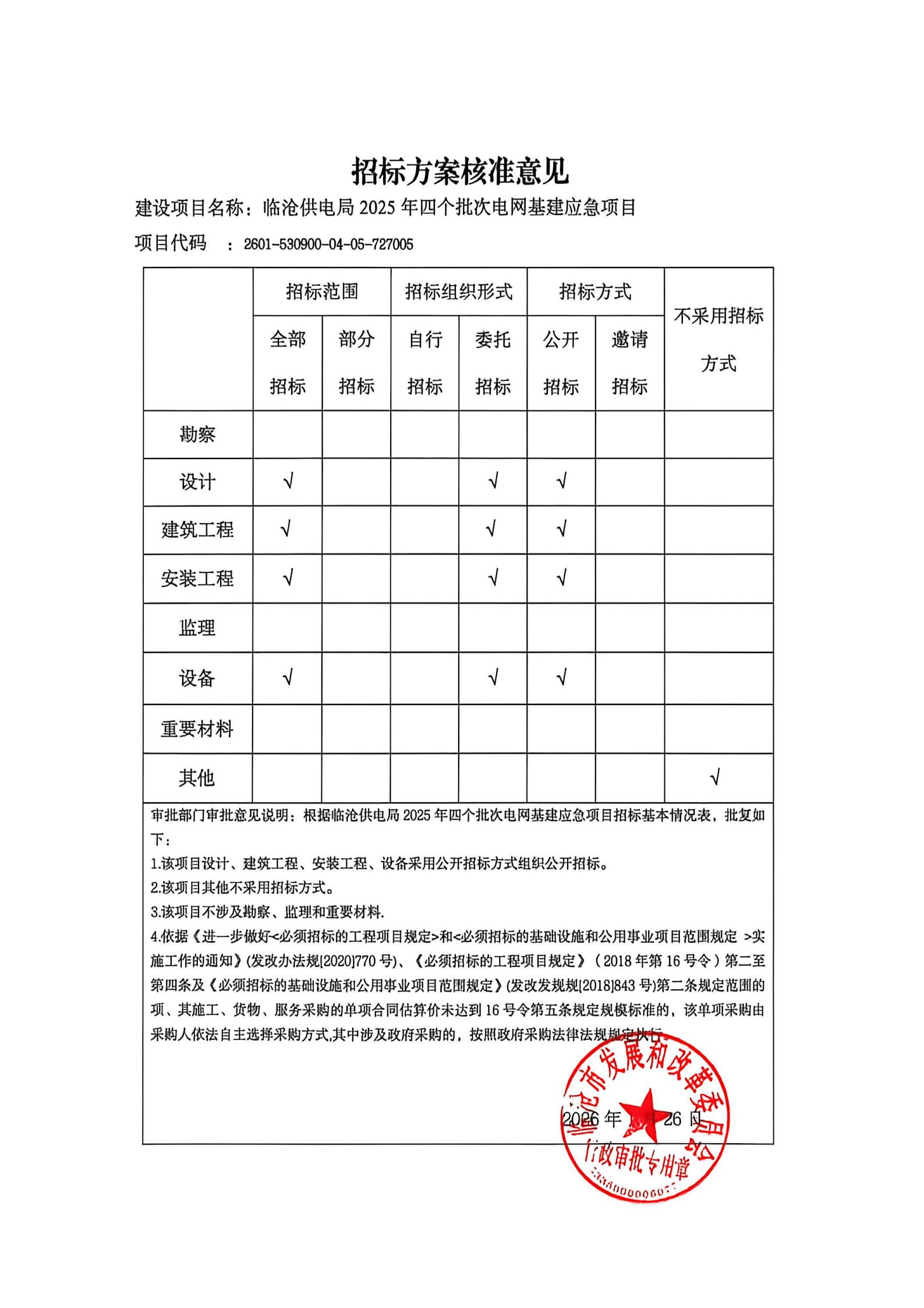 你局所报《云南电网有限责任公司临沧供电局关于核准临沧供电局2025年四个批次电网基建应急项目的请示》(临电规建〔2026〕16号)及有关材料收悉。根据企业投资项目核准管理及有关法律法规的规定,经研究,现就临沧供电局2025年四个批次电网基建应急项目(项目代码:2601-530900-04-05-727005)核准事项批复如下: