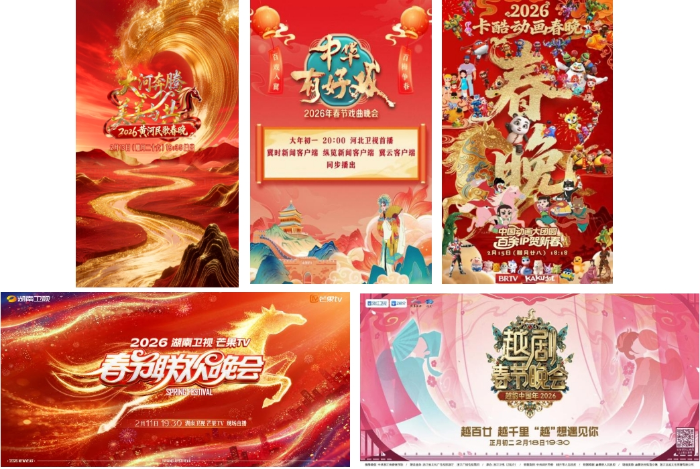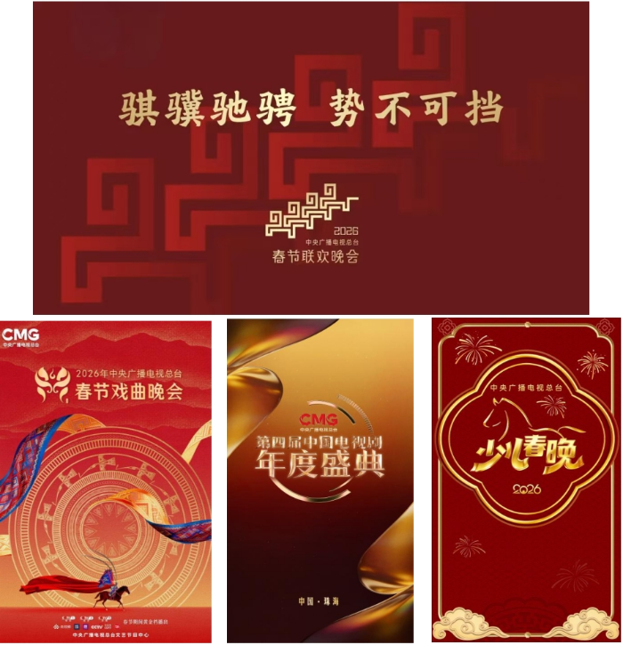 春节期间,广播电视与网络视听同频共振,大屏小屏各类精彩节目骏马驰屏、好戏连台。40多场特色春晚精彩纷呈,既有综合类晚会,也有歌舞、戏曲、相声、动画、民歌、少儿、老年、对农、丝路等丰富主题,从腊月二十三至元宵节轮番上映、精彩不停。中央广播电视总台《2026年春节联欢晚会》以“骐骥驰骋 势不可挡”为主题,在“欢乐吉祥、喜气洋洋”的主基调下,从中华优秀传统文化中汲取创意灵感,从新大众文艺的创新中吸纳创作养分,从开心、贴心、暖心、信心等多个角度持续打造“人民的春晚”。精心安排歌舞、戏曲、语言、魔术、创意融合等多类型节目,突出浓浓的年味,传递喜庆吉祥的色彩,赞美幸福的生活。《CMG第四届中国电视剧年度盛典》是一台致敬优秀剧目和主创的文艺晚会,将汇聚中国电视剧行业优秀的导演、编剧、演员,充分彰显国家主流媒体引领力、影响力。《2026年春节戏曲晚会》集结全国近80家文艺团体、30余个戏曲剧种,融合仙侠短剧、情景演绎、诗乐戏韵等多元形式,借助影视化叙事与数字特效,打造时尚感、年轻化的戏曲传播新样态。《2026年中央广播电视总台少儿春晚》聚焦“健康宝贝添新岁”主题,以“潮、酷、乐、燃”为风格基调,通过富有创意与温度的节目编排,展现新时代少年儿童健康活泼、自信昂扬的成长姿态。