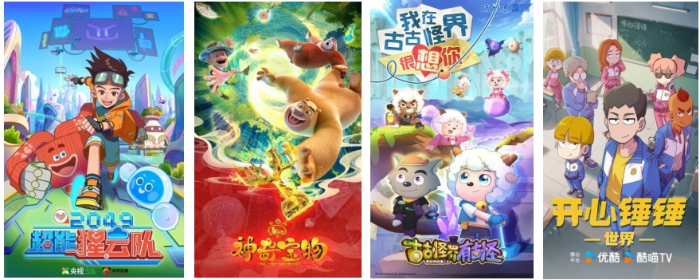 动画片童趣满满、启迪成长,央视少儿频道《2049:超能猩云队》展望新中国成立百年时的科技图景;北京卡酷《熊出没之神奇宝物》赋予文物神奇能力,带领观众开启森林冒险;金鹰卡通《喜羊羊与灰太狼之古古怪界有古怪》开启奇妙地心世界大冒险;优酷《开心锤锤世界5》用趣味设定包裹生活智慧,轻松解压。