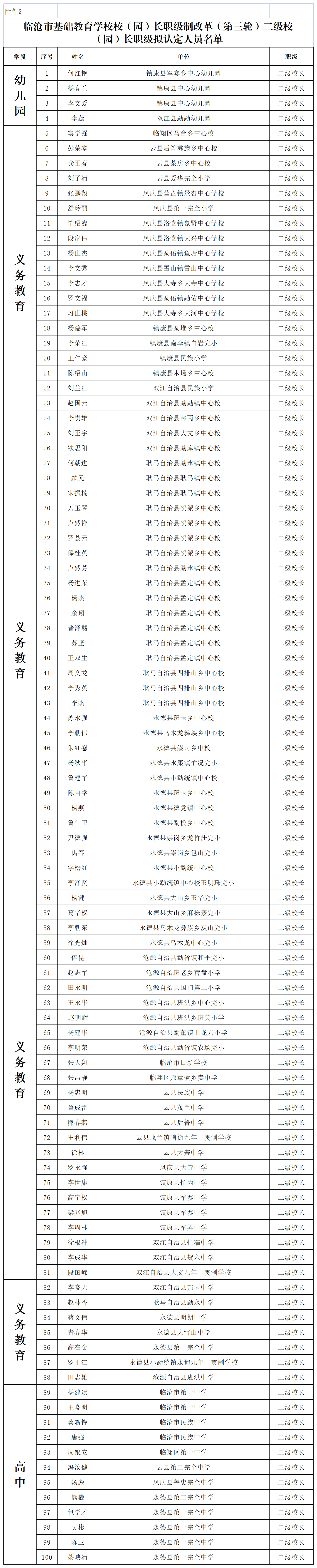 根据《云南省教育厅办公室关于开展2025年全省基础教育学校校长职级评审和认定工作的通知》和《临沧市推行基础教育学校校长职级制改革工作的实施方案》等文件要求,已完成文件中规定的既定程序。现对临沧市基础教育学校校(园)长职级制改革(第一轮)一级、二级校(园)长职级拟认定人员(详见附件1、附件2)进行公示。最终认定全市基础教育学校一级、二级校(园)长职级人员数,将按县(区)和市直学校一级至五级校(园)长资格条件符合人数的5%、25%比例确定。