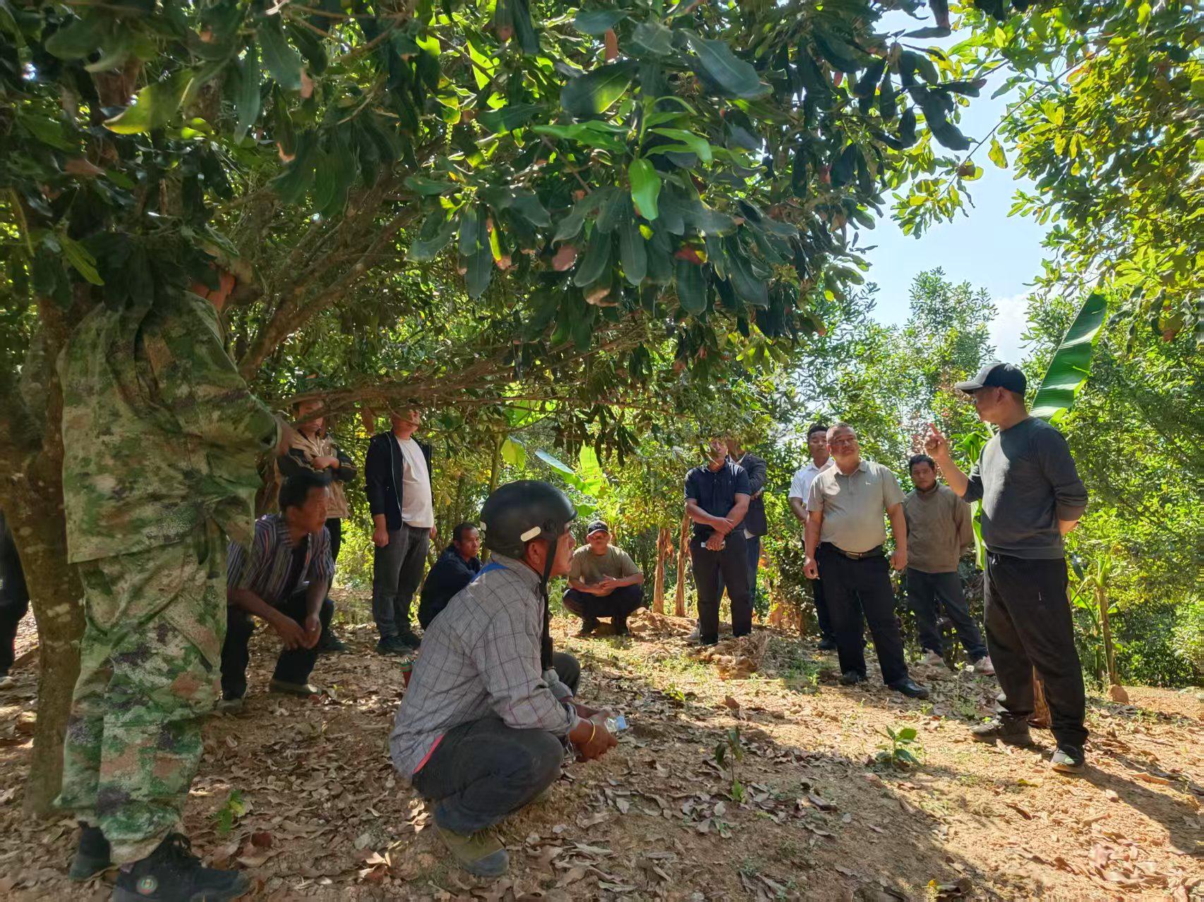 活动当天,专班一行通过现场培训、技术演示与座谈交流相结合的方式,为当地坚果产业发展注入新动能。拥有丰富实践经验的“土专家”白莲军、白建军同志,结合自身多年种植心得,为参会乡村干部、技术骨干及果农代表详细讲解了病虫害绿色防控、科学营养补充、精准水分管理等关键管护技术,内容贴近实际,操作性强。