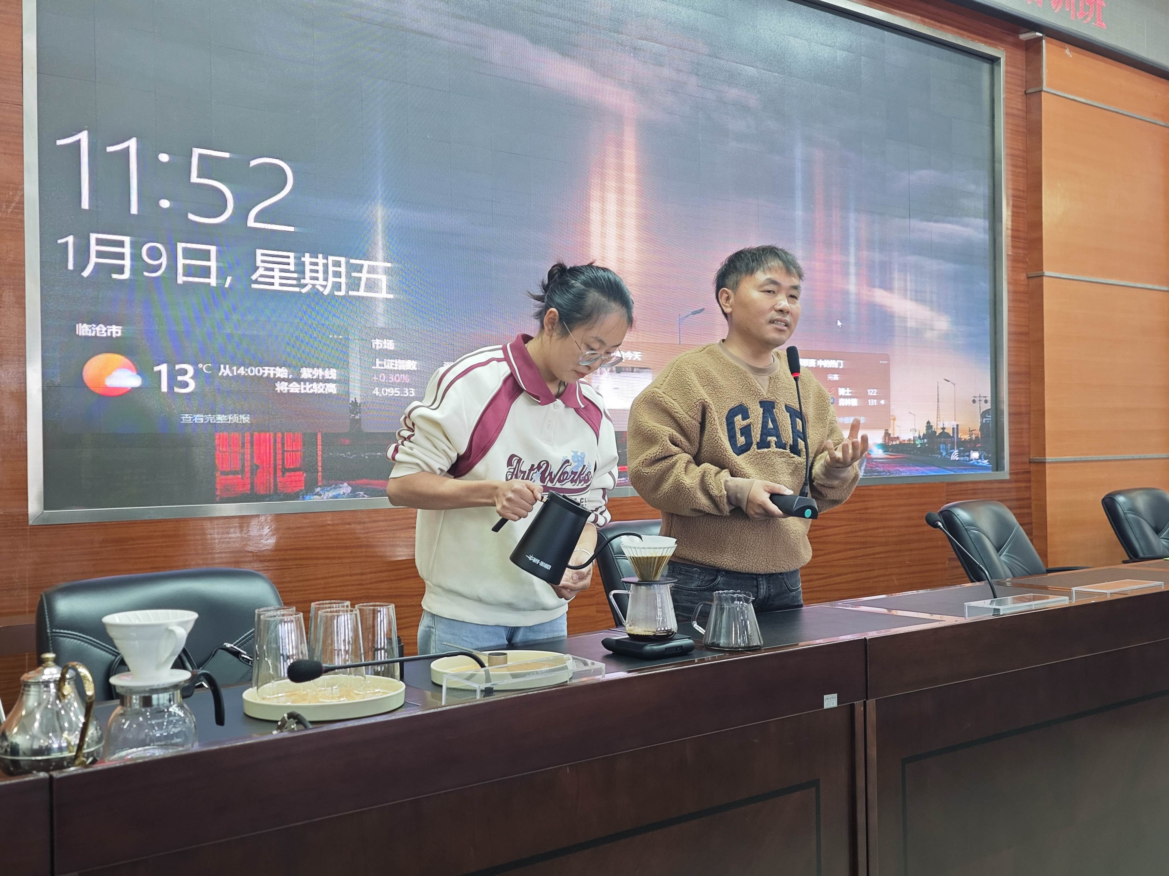 随后,临沧惠祥咖啡有限公司董事、总经理匡正鹏以《咖啡与生活》为主题,分享咖啡产业发展历程与文化内涵。他现场示范了咖啡从冲泡、品鉴的全过程,引导干部职工在忙碌工作中学会调节身心、品味生活。