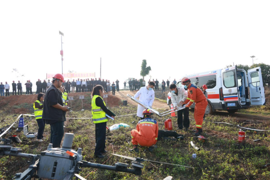 演练现场先进行了农用无人驾驶航空器飞防和农资吊装表演,展现现代农业智能化发展成果。随后启动的应急演练,模拟农用无人驾驶航空器作业时失衡坠落砸中群众的事故场景,从操作员紧急停机、报案戒备,到医疗、消防、农机监理等多部门联动开展现场警戒、伤员救治、残骸处置、勘查取证、理赔衔接等全流程操作,规范有序、处置高效,全面检验了应急预案的实用性和可操作性。