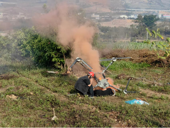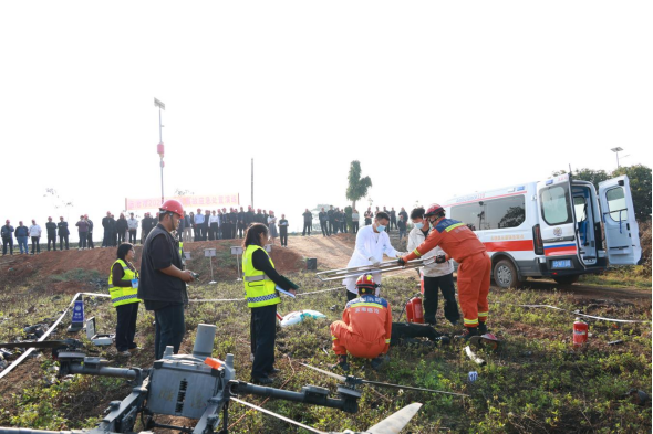 演练活动分为两个阶段进行。首先,农用无人机飞防和农资吊装表演展示了现代农业智能化发展的成果,无人机在技术员的操作下灵活穿梭于模拟农田上空,精准完成施药和吊运作业。随后,应急演练正式拉开帷幕。模拟场景设定为永德县永康镇送吐村一名农用无人机操作员在田间作业时,因对周边环境观察不足,导致无人机挂碰果树树枝后失衡坠落,砸中附近正在除草的群众。