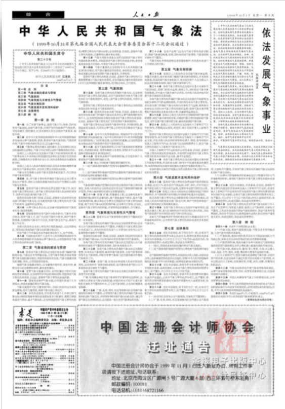 1999年11月1日《人民日报》全文刊登了《中华人民共和国气象法》并配发评论员文章。