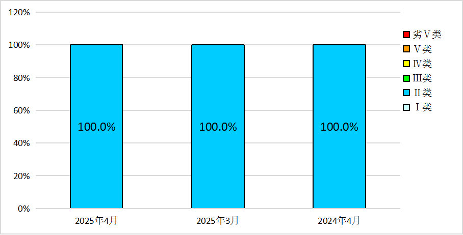 按《水污染防治行动计划实施情况考核规定》评价,2025年4月和2025年1-4月,全市3个饮用水水源地取水点水质均达标,达标率为100%。