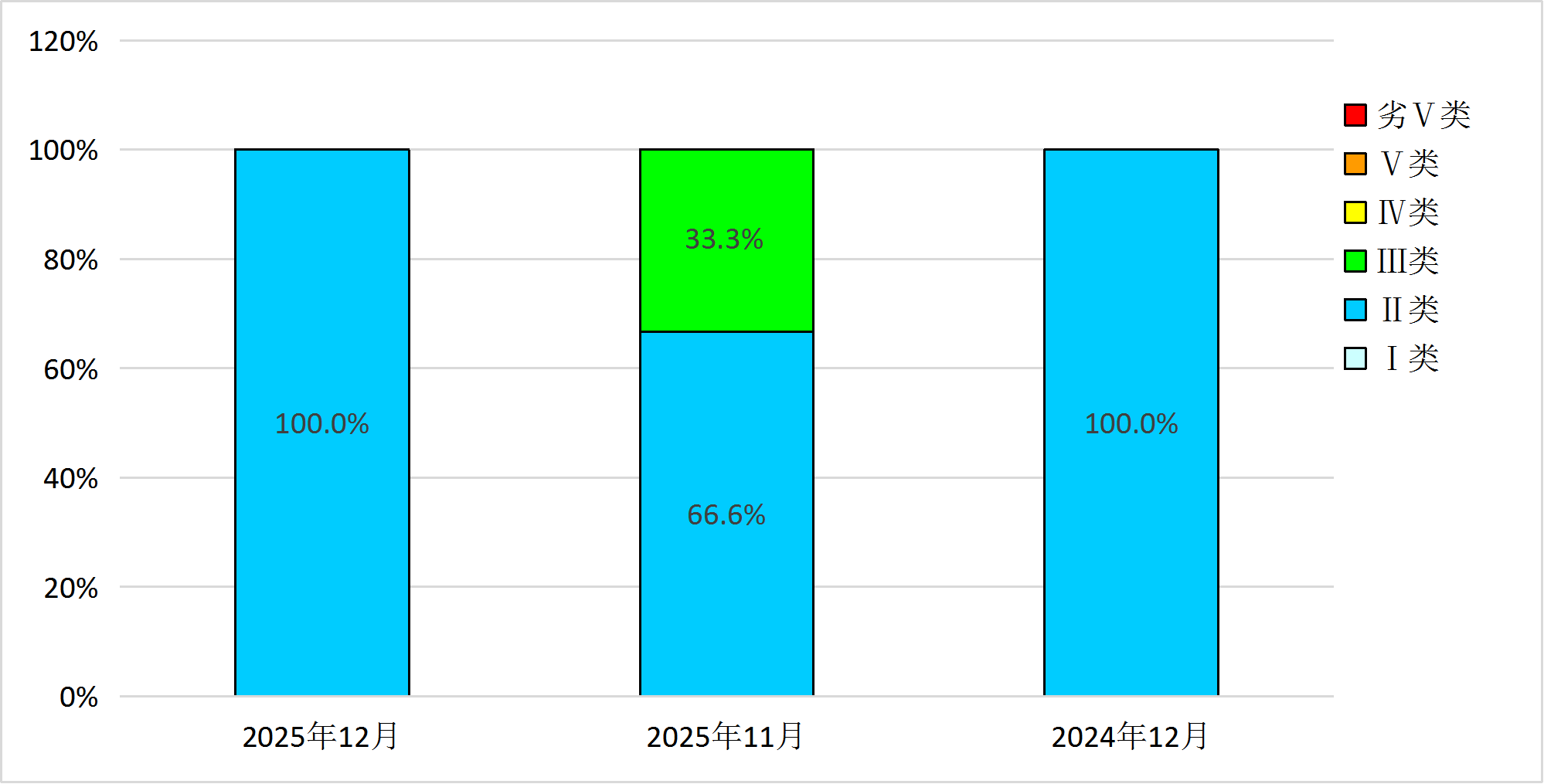 按《地表水环境质量标准》(GB3838-2002)表1基本项目评价,2025年12月,临沧市3个地级以上城市集中式在用饮用水水源地取水点水质均符合地表水Ⅱ标准,水质状况为优,水质优良比例为100%。与上年同期相比,水质无明显变化;与上月相比,中山水库水质有所好转(由良好好转为优),铁厂河水库和鸭子塘水库水质无明显变化。2025年1-12月,临沧市3个地级以上城市集中式在用饮用水水源地取水点水质均符合地表水Ⅱ类标准,水质状况为优,水质优良比例为100%。总体水质无明显变化。