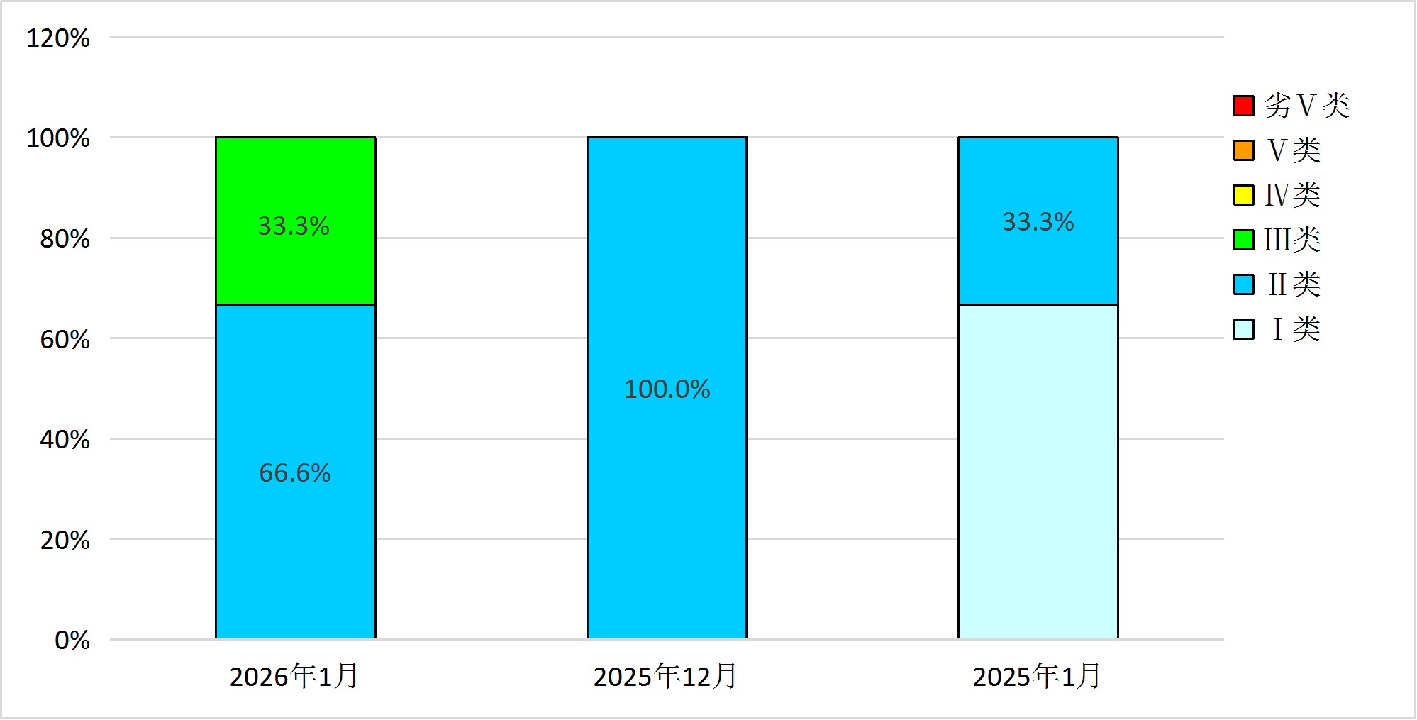 按表2补充项目和表3优选特定项目评价,2026年1月,3个饮用水水源地取水点水质均达标,达标率100%,与上月和上年同期持平。