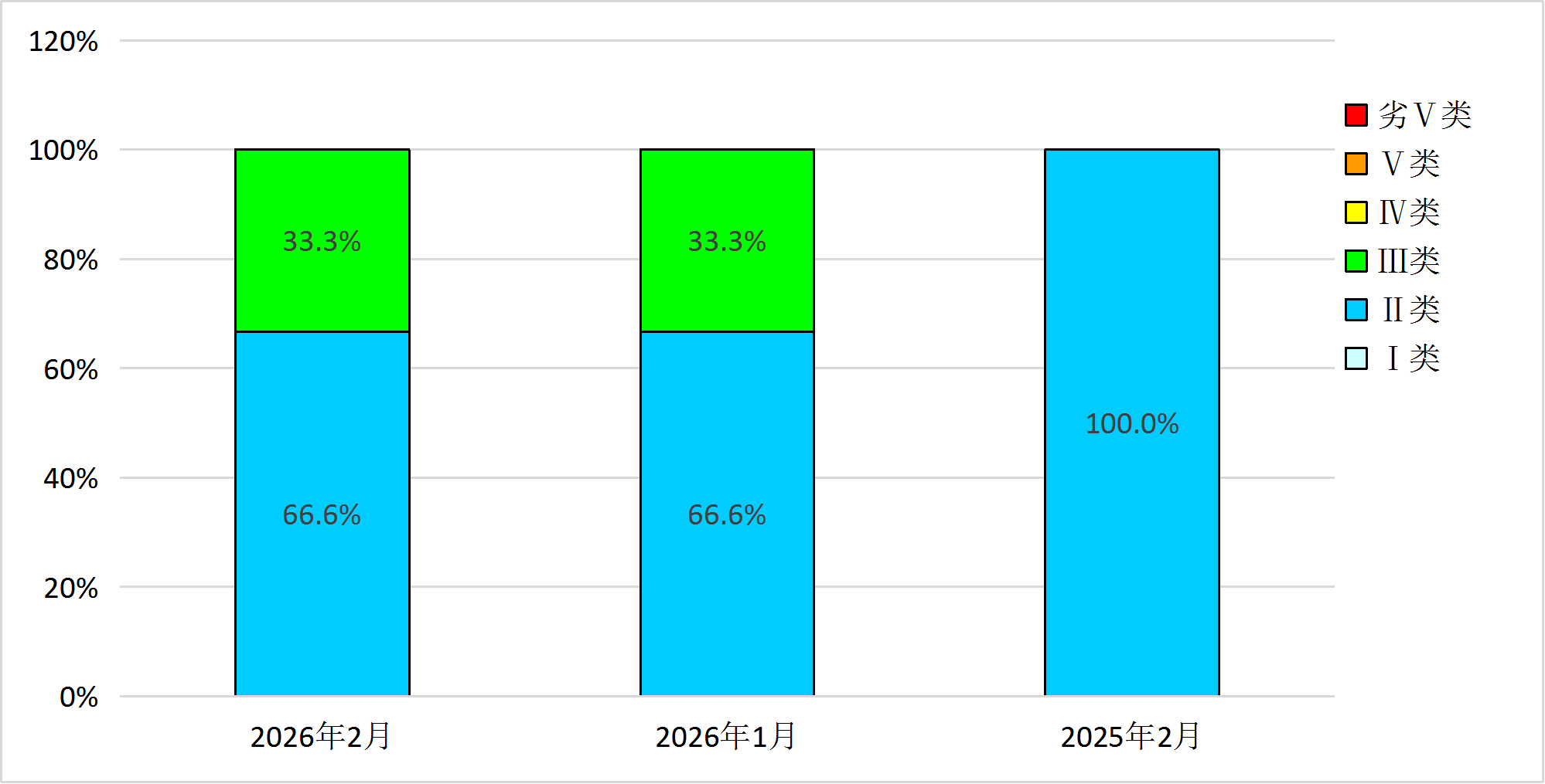按表2补充项目和表3优选特定项目评价,2026年2月,3个饮用水水源地取水点水质均达标,达标率100%,与上月和上年同期持平。2026年1-2月,3个饮用水水源地取水点水质均达标,达标率100%,与上年同期持平。
