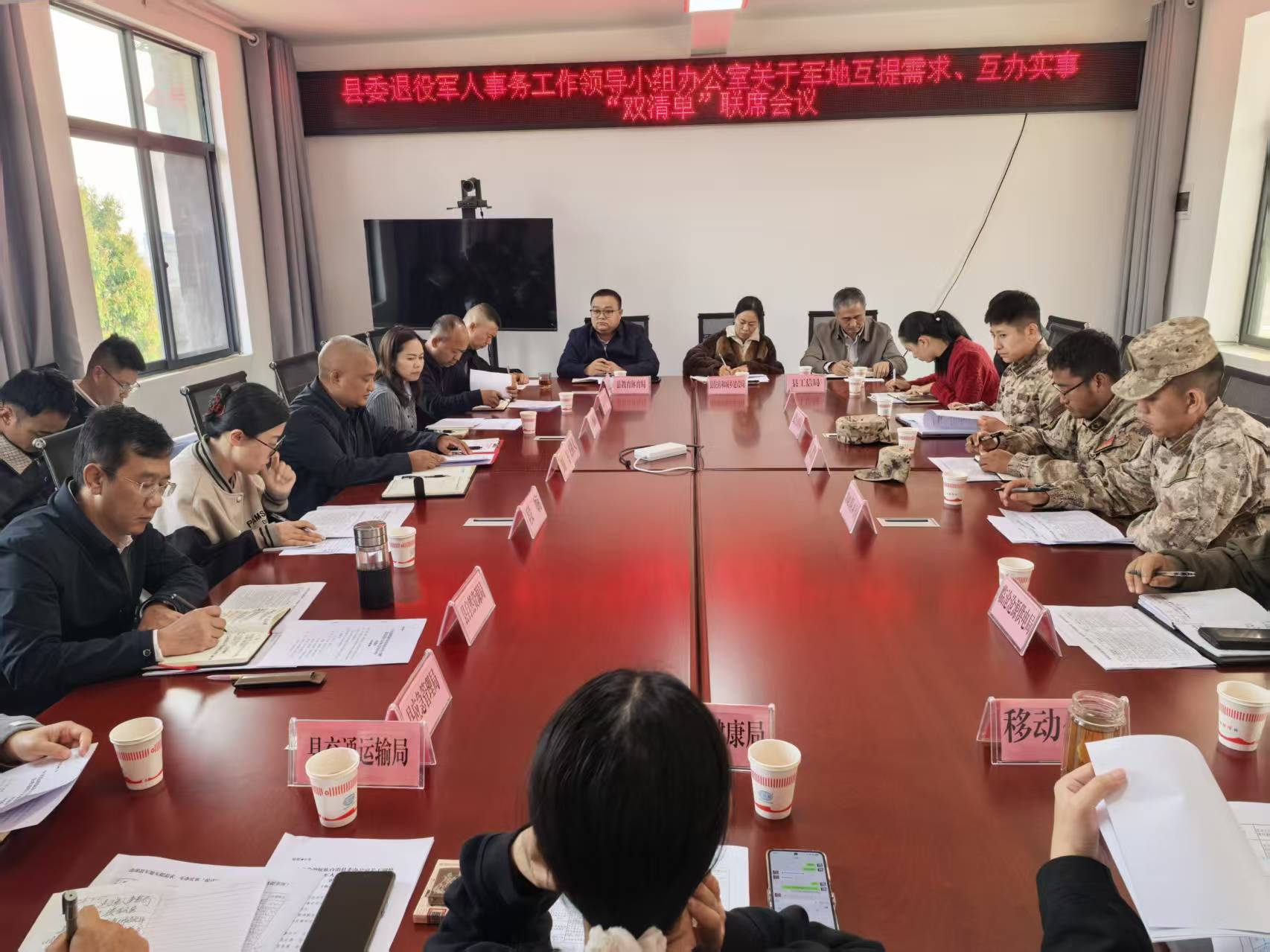 为积极发挥军地优势,形成“军地互联互通、互提需求、互办实事”的“双清单”制度优势,3月27日,沧源自治县委退役军人事务工作领导小组召开军地互提需求、互办实事联席会议。进一步凝聚军地同心、军民合力的强大合力,巩固发展坚如磐石的军政军民团结,推动军地双向服务从“运动式”转向制度化、常态化、精准化,服务备战打仗与地方高质量发展大局。军地双方共提出需求29条(其中:部队需求19条,部门需求10条),并制定军地互办实事“双清单”,交由双方所涉及的职能部门进行落实完成。