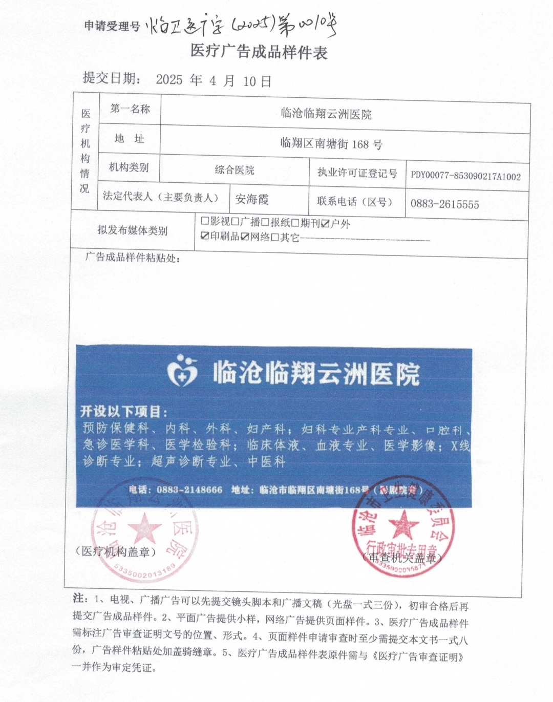 我委于2025年4月10日收到临沧临翔云洲医院的医疗广告审查申请,经审核,于2025年4月10日拟批准该医疗广告申请。现将批准事项公示如下: