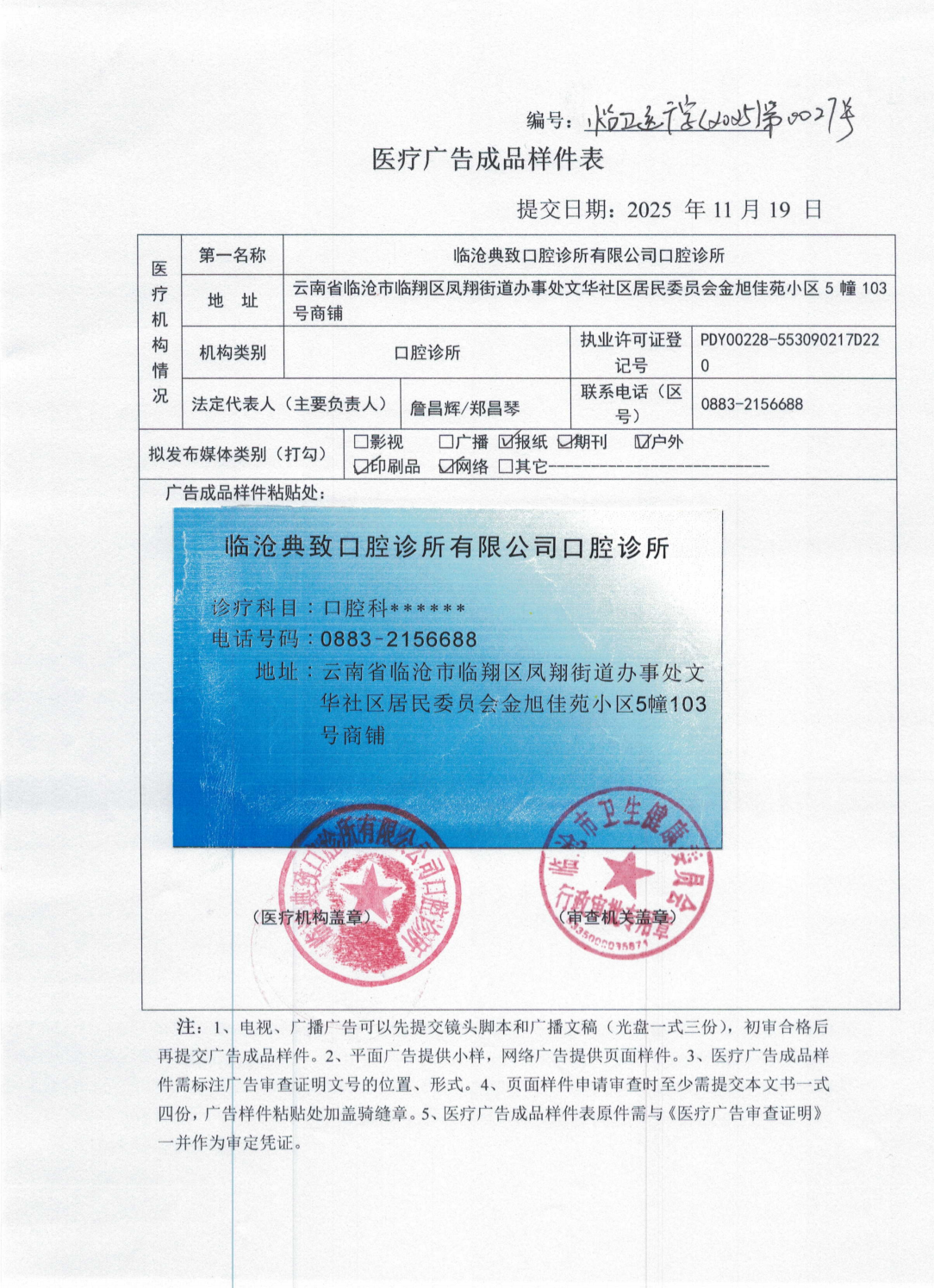我委于2025年11月19日收到临沧典致口腔诊所有限公司口腔诊所的医疗广告审查申请,经审核,于2025年11月19日拟批准该医疗广告申请。现将批准事项公示如下:
