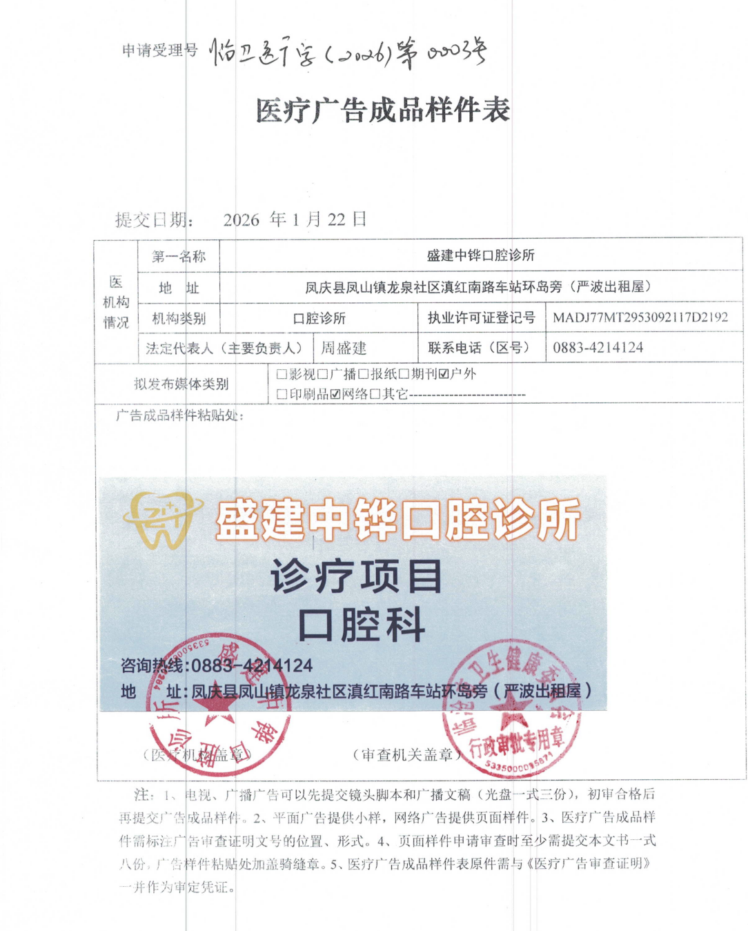 我委于2026年1月22日收到盛建中铧口腔诊所的医疗广告审查申请,经审核,于2026年1月22日拟批准该医疗广告申请。现将批准事项公示如下: