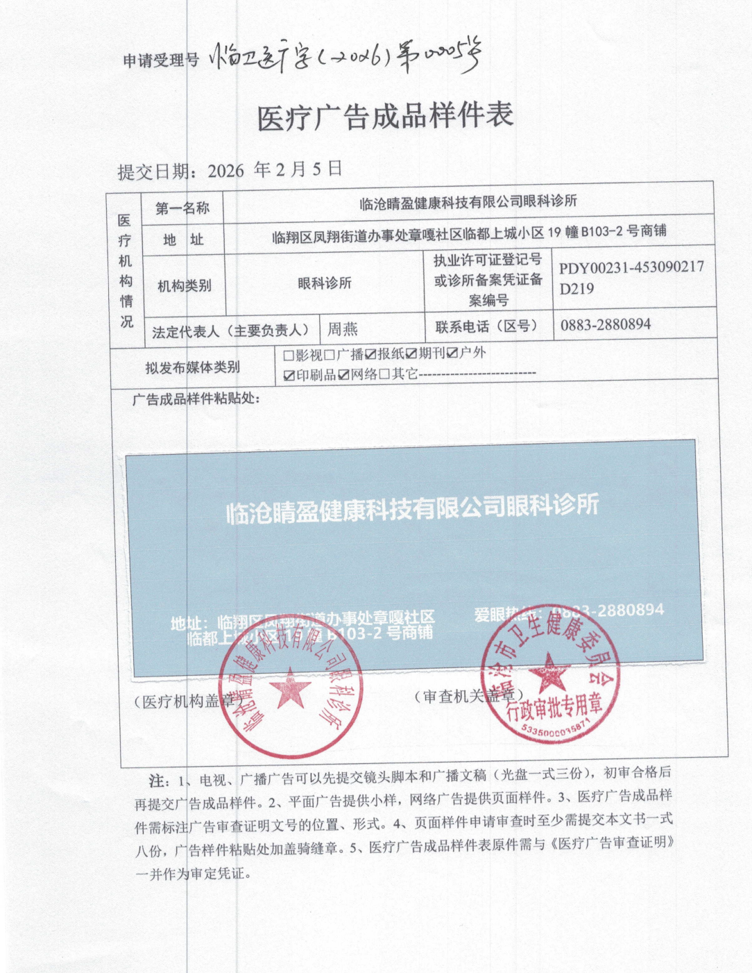 我委于2026年2月5日收到临沧睛盈健康科技有限公司眼科诊所的医疗广告审查申请,经审核,于2026年2月5日拟批准该医疗广告申请。现将批准事项公示如下: