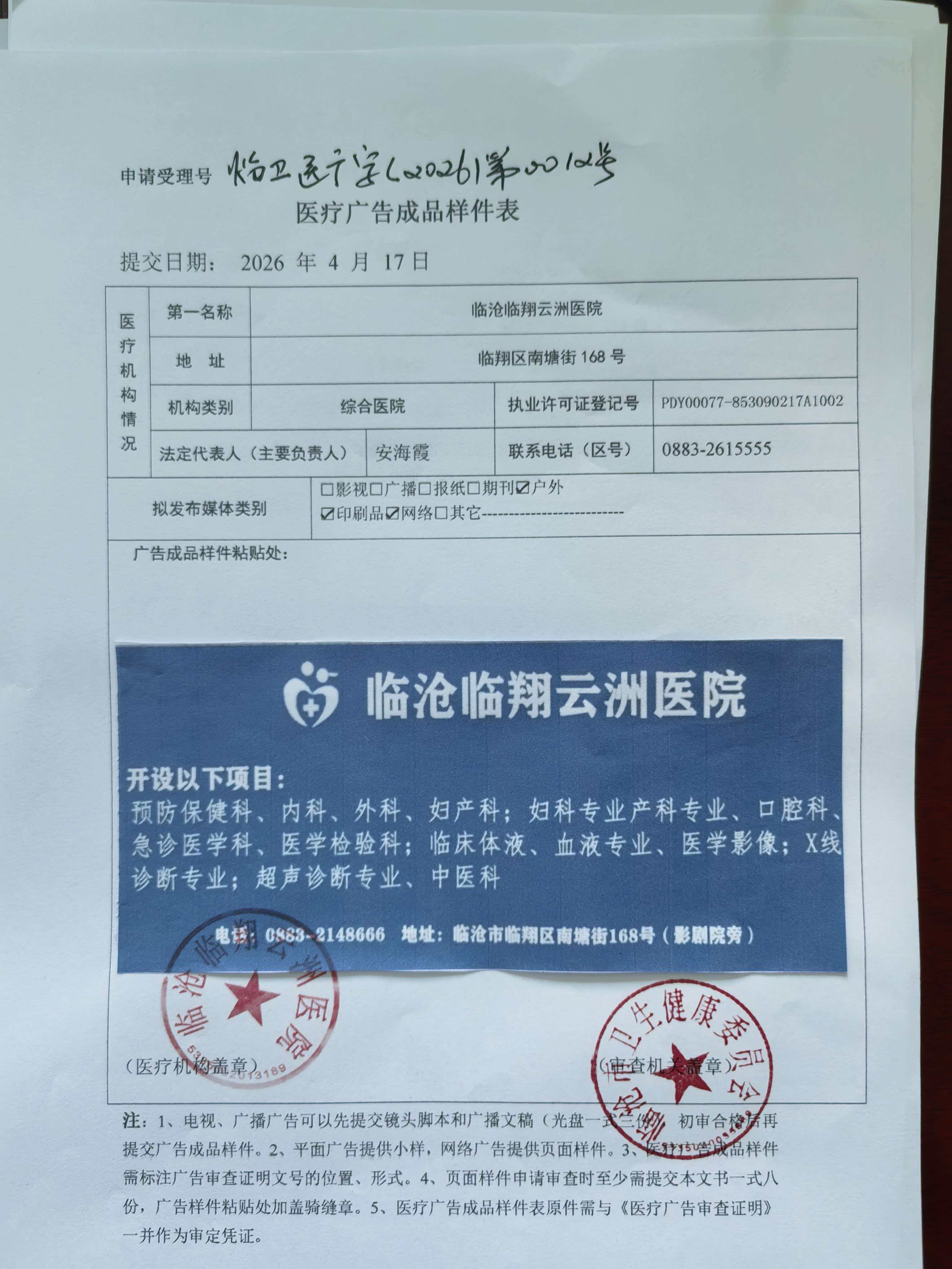 我委于2026年4月17日收到临沧临翔云洲医院的医疗广告审查申请,经审核,于2026年4月17日拟批准该医疗广告申请。现将批准事项公示如下: