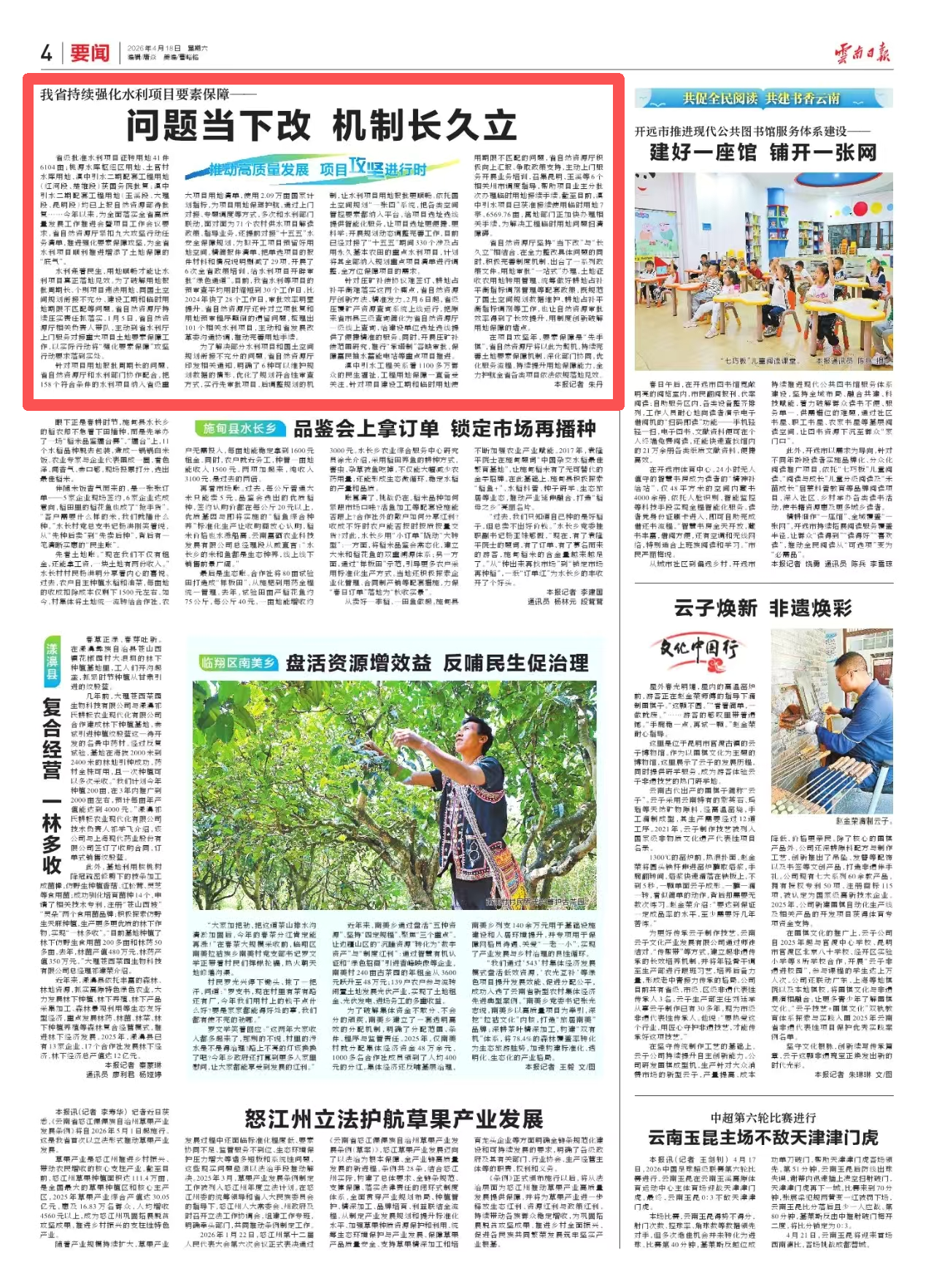 为了解决部分水利项目和国土空间规划衔接不充分的问题,省自然资源厅印发相关通知,明确了6种可以维护规划数据的情形,优化了规划符合性审查方式,实行先审批项目、后调整规划的机制,让水利项目用地报批更顺畅。依托国土空间规划“一张图”系统,把各类空间管控要素都纳入平台,给项目选址选线提供智能化服务,让项目选址更便捷、更科学;开展规划动态调整完善工作,目前已经对接了“十五五”期间330个涉及占用永久基本农田的重点水利项目,计划将其全部纳入规划重点项目清单进行调整,全方位保障项目的需求。